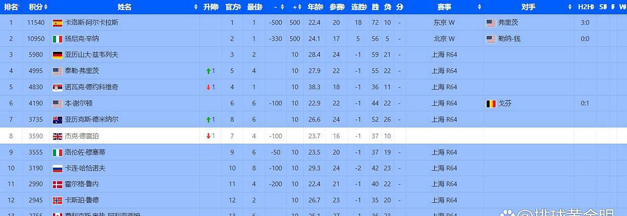 阿尔卡拉斯在东京夺冠成功保住了去年中网冠军所获得的积分,目前以11540分稳居即时排名第一;而辛纳在北京夺冠后,积分也达到了10950,距离世界第一的阿尔卡拉斯11540分仅相差590分。去年,辛纳在上海大师赛夺冠,而阿尔卡拉斯则止步8强,因此辛纳在本年度上海赛的表现将直接影响年终世界第一的角逐局势。
