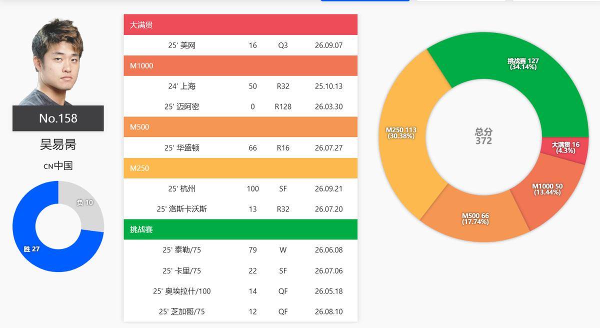 ,这一站的四强成绩,足以让吴易昺收获100分的巨分,以及53165美元的奖金,约合38万人民币的奖金。即时世界排名已经攀升了38位,来到了158位。仅次于小布,是咱家男选手的第二名。因为身体状态的缘故,吴易昺已经选择退出了下即将开始的中网,会把更多的精力放在下周开始的上海1000赛了。加油!