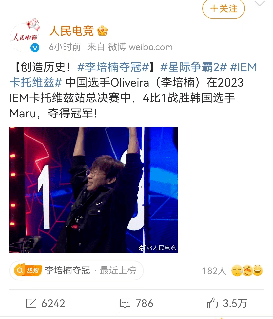 北京时间2月13日,知名国际电竞赛事“英特尔极限大师赛”(IEM)在波兰卡托维兹决出了“星际争霸2”(Starcraft 2)比赛项目的冠军。中国选手李培楠(Oliveira)在决赛以4-1击败韩国选手Maru夺冠,成为了中国星际争霸项目二十余年来首个男子单人世界冠军,创造了历史。