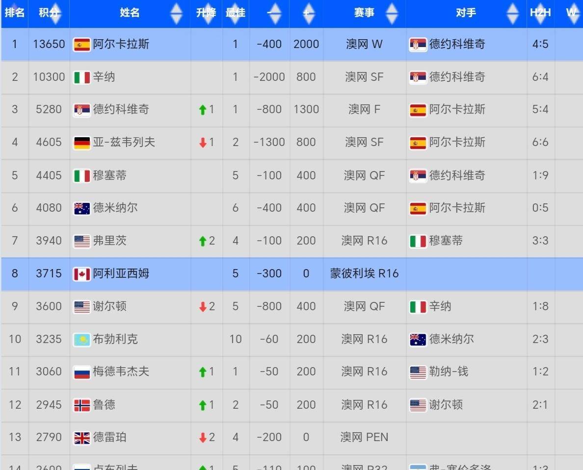 最大的赢家无疑是阿尔卡拉斯。 夺冠让他狂揽2000个冠军积分,由于去年澳网他早早出局,这次几乎净增了1600分。 他的总积分来到了骇人的13650分,这是一个创下他个人生涯纪录、同时也是近年來罕见的超高分数。 这意味着什么? 意味着排名第二的扬尼克·辛纳,虽然也坐拥10300分的巨额积分,但依旧被阿尔卡拉斯甩开了超过3000分的差距。 网球世界的“山顶”,如今站着一位孤独的王者,他的领先优势,是断崖式的。