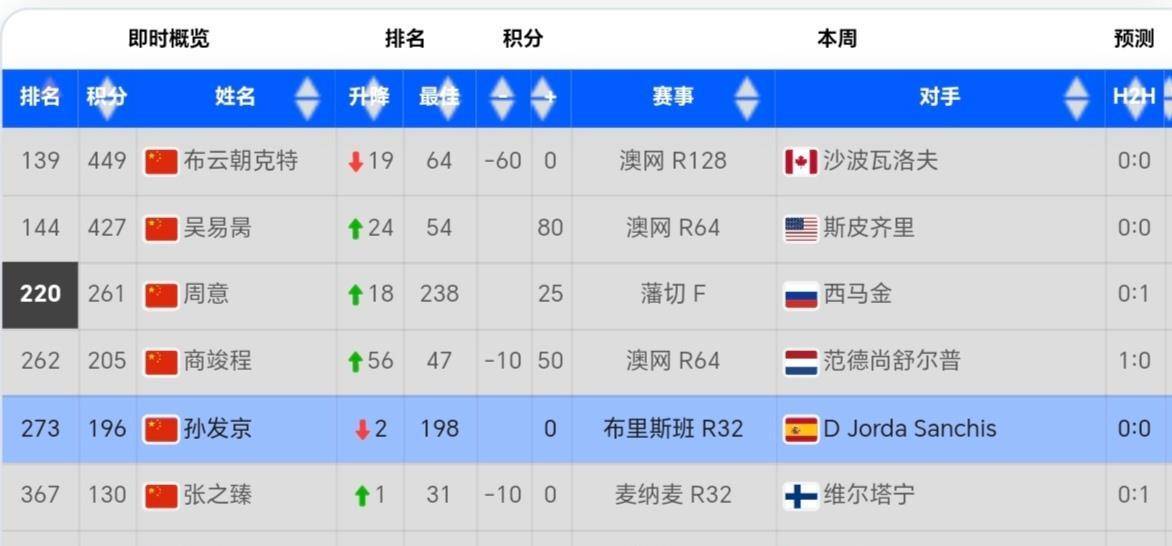 目前排名最高的中国球员是布云朝克特,但这次澳网之旅并未能给他带来助力。 他的排名下降了19位,滑落至第139位。 一个尴尬的瓶颈摆在他面前:迟迟无法在大满贯正赛中取得一场胜利。 这就像一扇看不见的天花板,限制着他的积分快速攀升和排名飞跃。 没有大满贯正赛胜利的突破,每一步都会走得格外艰难。