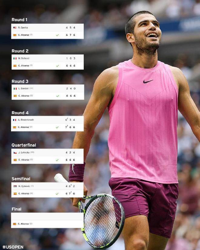 在奖金和积分方面,阿尔卡拉斯确保将获得至少250万美元的奖金和1300个ATP积分,而德约科维奇则收获126万美元和800个积分。决赛中,阿尔卡拉斯将迎战意大利新星辛纳和加拿大好手阿利亚西姆之间的胜者。无论面对哪位对手,西班牙人都将向个人第二座美网冠军奖杯发起冲击。